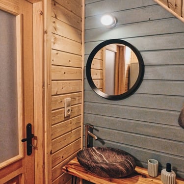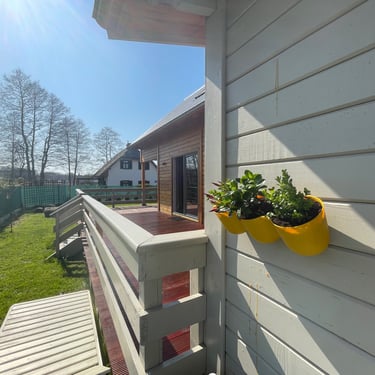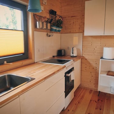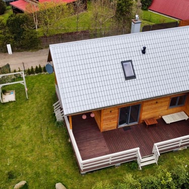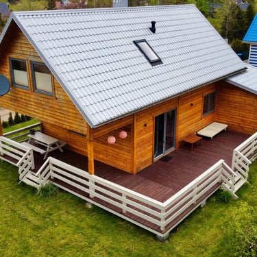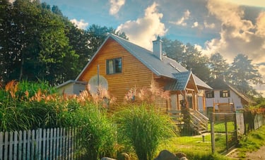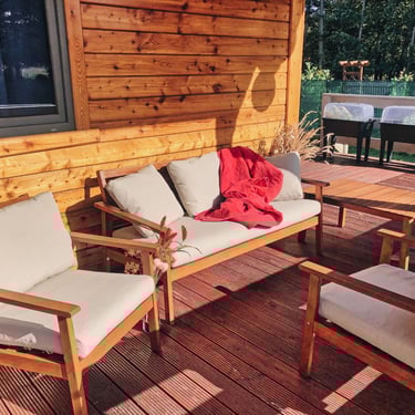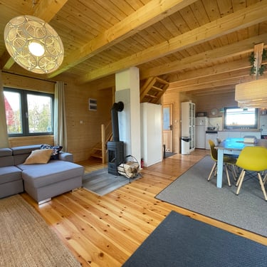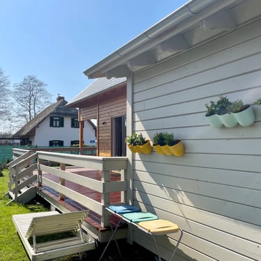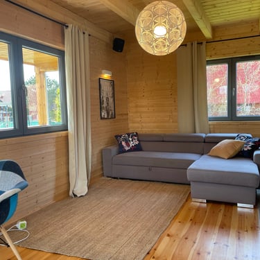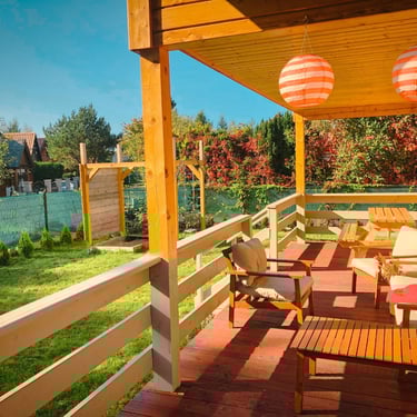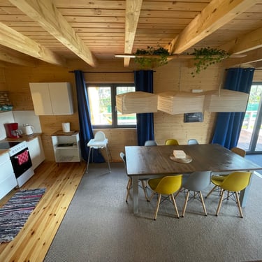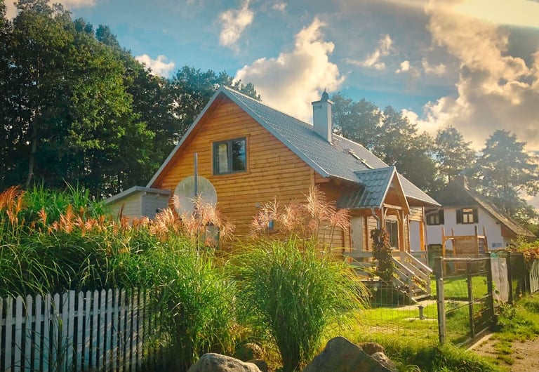 Na zewnątrz znajduje się miejsce na grilla i małe ognisko, a także komplet mebli wypoczynkowych, hamak i leżanka.