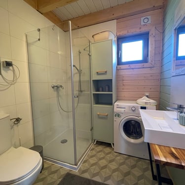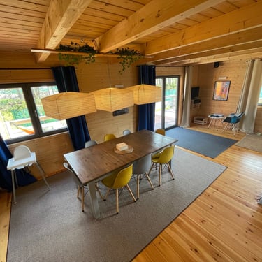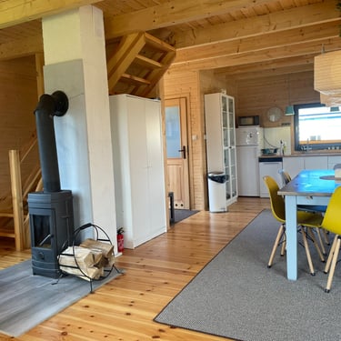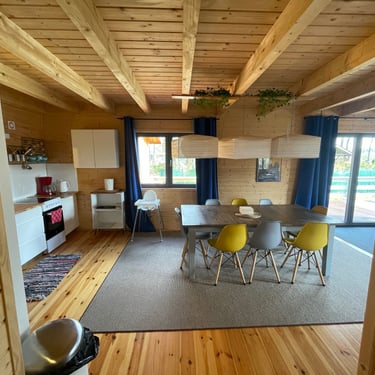 Na parterze znajduje się przestronny salon z aneksem kuchennym, wyposażonym we wszystkie niezbędne urządzenia kuchenne. Duży stół w salonie pomieści do 11 osób, co sprawia, że Willa Arkadia to idealne miejsce na wspólne posiłki i rodzinne spotkania.